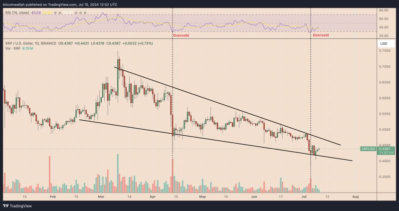 从技术角度来看,XRP的上涨是超卖反弹的一部分。当资产的相对强弱指数(RSI)跌破30时,这种反弹是市场的典型反应。此外,XRP价格在测试其当前下降楔形模式的下趋势线作为支撑后反弹,这与其4月份的趋势类似。如果这种模式重复,7月份的下一个上行目标可能在楔形的上趋势线附近,约为0.45美元,比当前价格水平上涨5%。