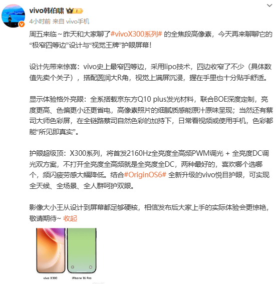 【太平洋科技快讯】9 月 5 日消息,vivo 产品经理韩伯啸今天公布了 X300 与 iPhone 16 Pro 的正面同框对比图,并透露 X300 在边框控制上实现了新突破。新机采用 vivo 史上最窄四等边设计,结合 lipo 技术和圆润大 R 角处理。