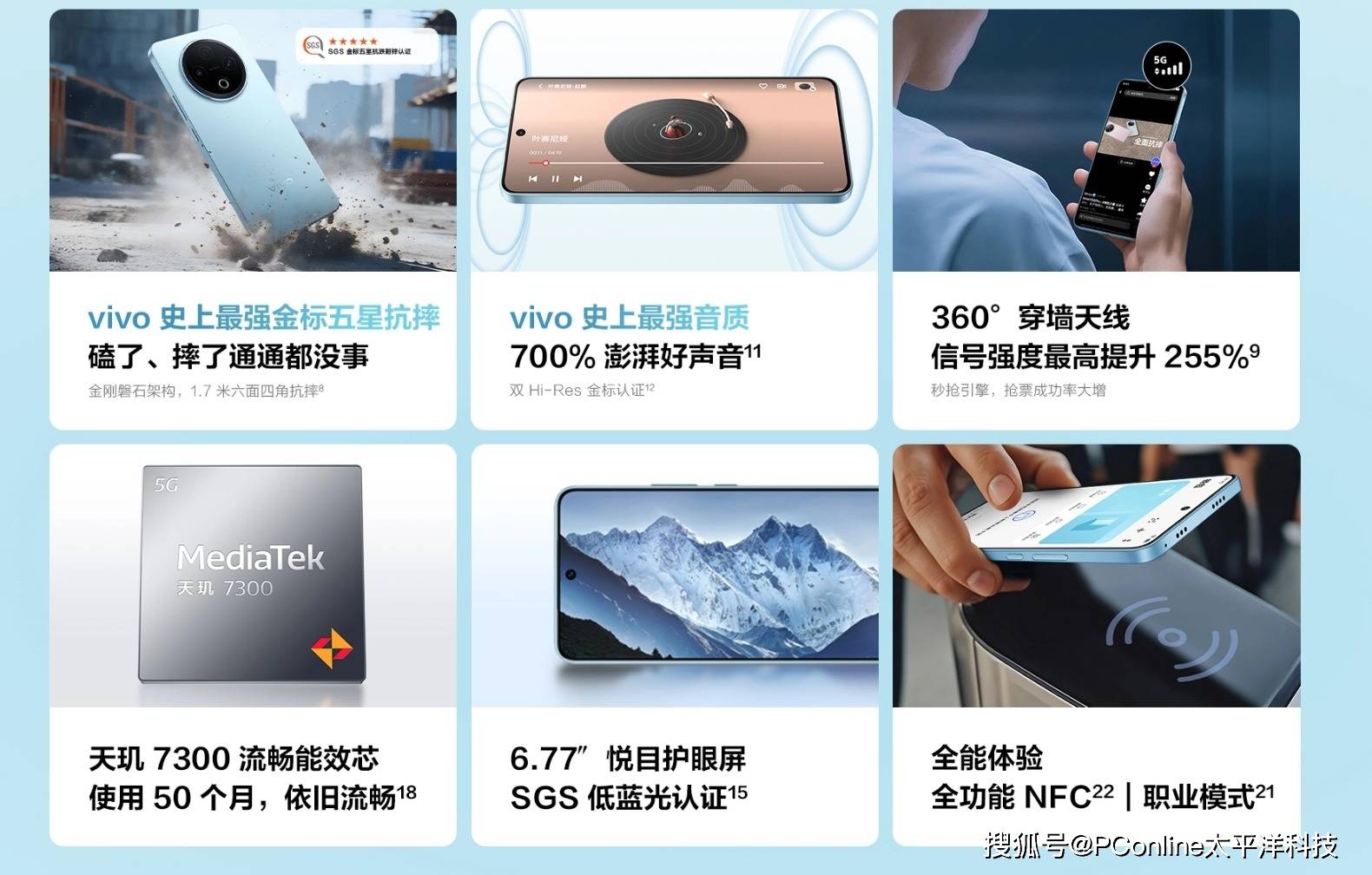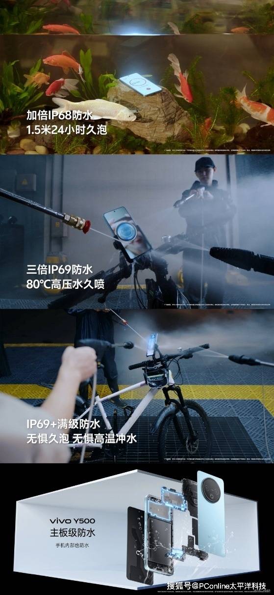 除了续航,Y500的耐用性更是达到了军工级标准。它通过了IP68/69/69+满级防水认证,这意味着它不仅能轻松应对日常生活中的雨水泼溅,甚至能在1.5米水深处浸泡24小时,或承受80°C高温高压水流的持续冲刷而安然无恙。其内部关键元器件还增设了防水措施,具备主板级防水。同时,手机还拥有全新的金刚磐石架构,通过了SGS金标五星抗跌耐摔认证以及多项严苛的环境测试,抗跌落、抗压、抗弯折能力相比前代产品均有大幅提升,日常的意外跌落和刮擦基本无需担忧。