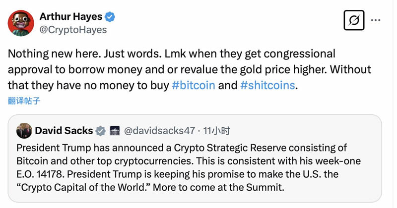 然而,也有市场声音对此持批评态度。BitMEX联合创始人海耶斯认为,这只是空谈,缺乏实际行动。他表示,除非获得国会批准借钱或提高黄金价格,否则没有资金购买比特币和山寨币。