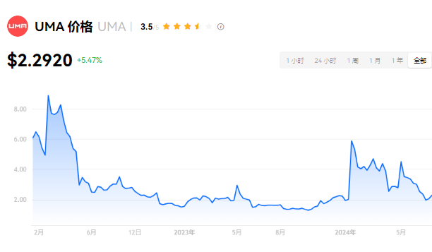 UMA的当前价格为$2.2920。在过去24小时内,UMA的价格上涨了+5.48%。目前,UMA在市值排名中位列第144名,实时市值为$1.89亿,流通供应量为81,876,336 UMA,最大供应量为120,187,620 UMA。我们会实时更新UMA/USD的价格。