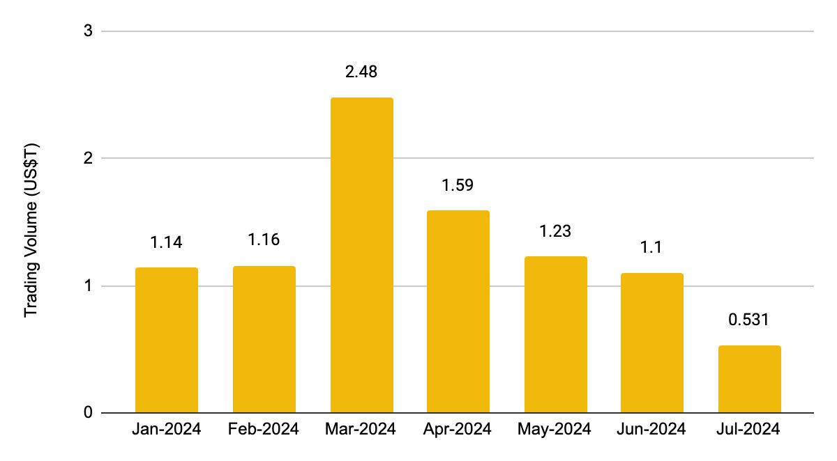 过去几个月对加密货币市场来说充满挑战。虽然年初市场表现强劲,但随后进入了横盘震荡期。6 月份市场出现明显下跌,加密货币总市值环比下降约 11.4%。尽管最近有所反弹,但与 3 月份的峰值相比,仍下跌约 14.0%。