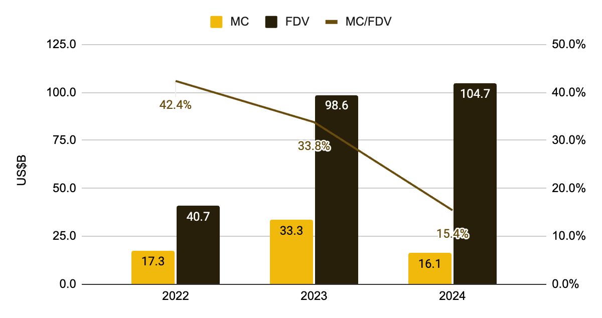 2024 年推出代币的市值 (MC) 与完全稀释市值 (FDV) 之比为近年来最低,这表明未来将有大量代币会被解锁。据估计,自 2024 年至 2030 年,将有价值约 1,550 亿美元的代币被解锁。