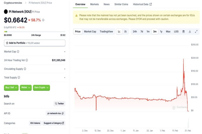 价格走势更令人关注。主网开放前,Pi 币凭证在热议中从 50 美元飙至 90 美元,首日上架交易所前的价格虽回落至 40 美元左右,但若按 1000 亿枚总供应量计算,其市值将直逼数万亿美元,这种估值显然难以为继。分析师预测,随着数百万用户急于兑现多年积累的 Pi 币,短期卖压可能将价格推至谷底。与此同时,长期前景则仰赖生态建设:若 Pi 能在支付、DeFi 或跨链应用中找到立足点,其价值或许还有翻身之日。