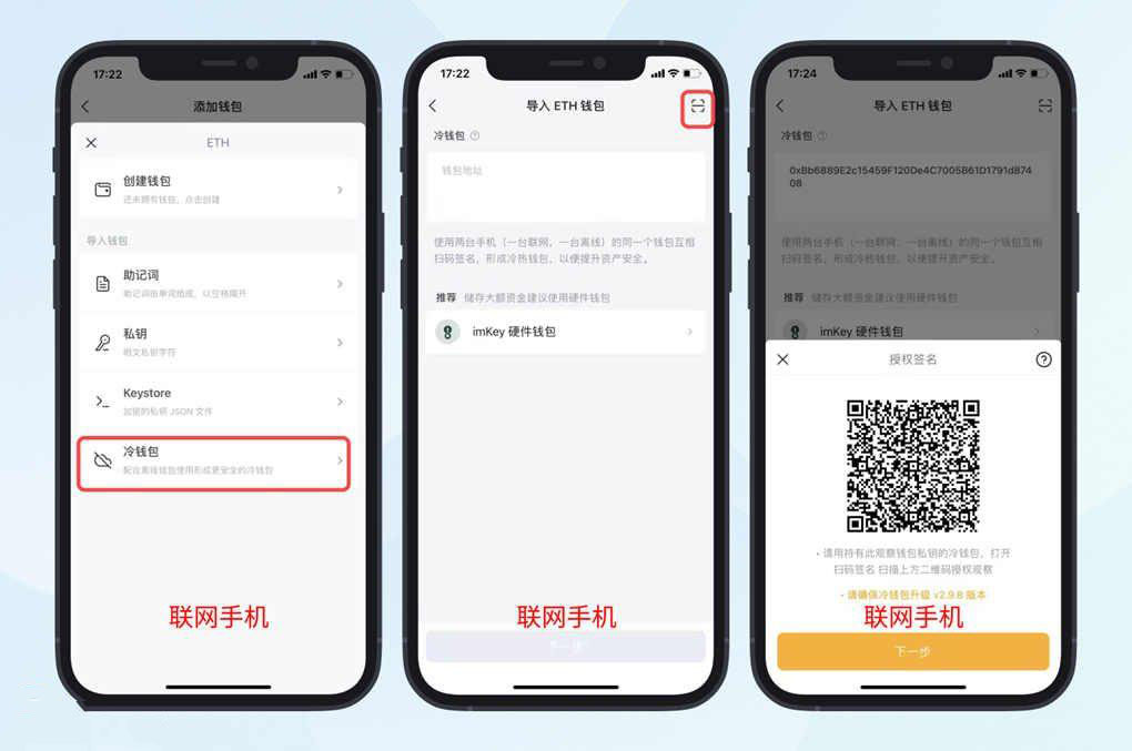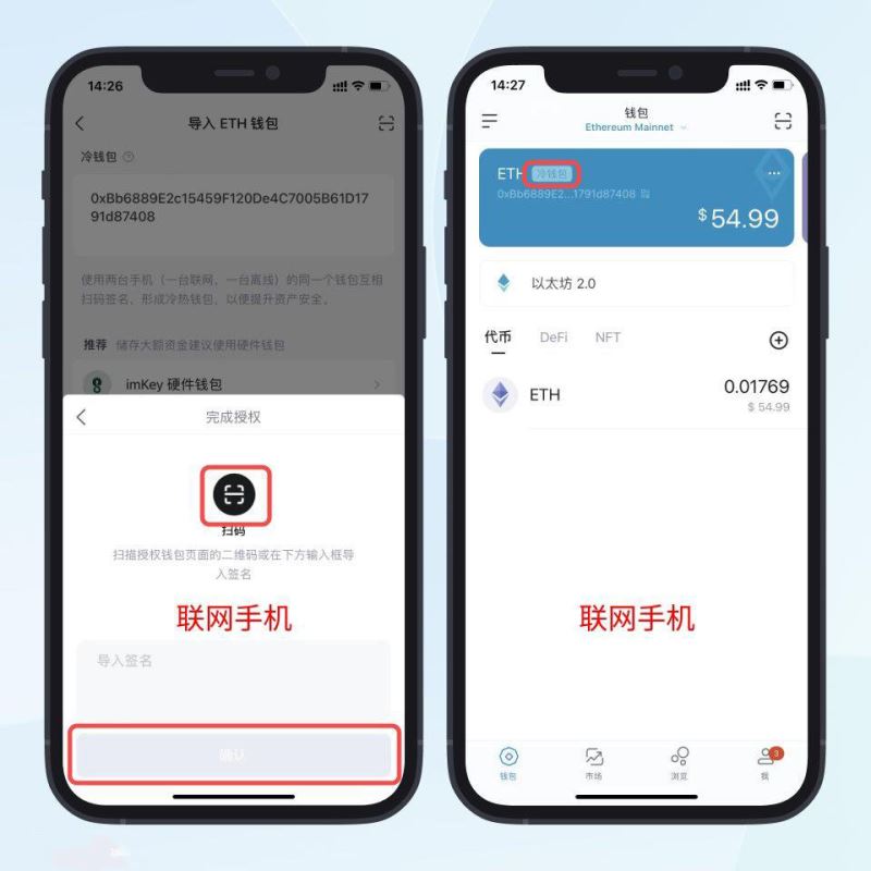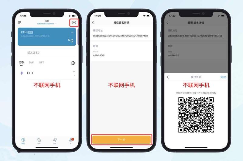点击「下一步」,点击扫描按钮,扫描不联网手机显示的授权签名二维码并点击「确认」,即可完成观察地址设置。现在,你可以在观察地址中查看硬件设备的余额了。