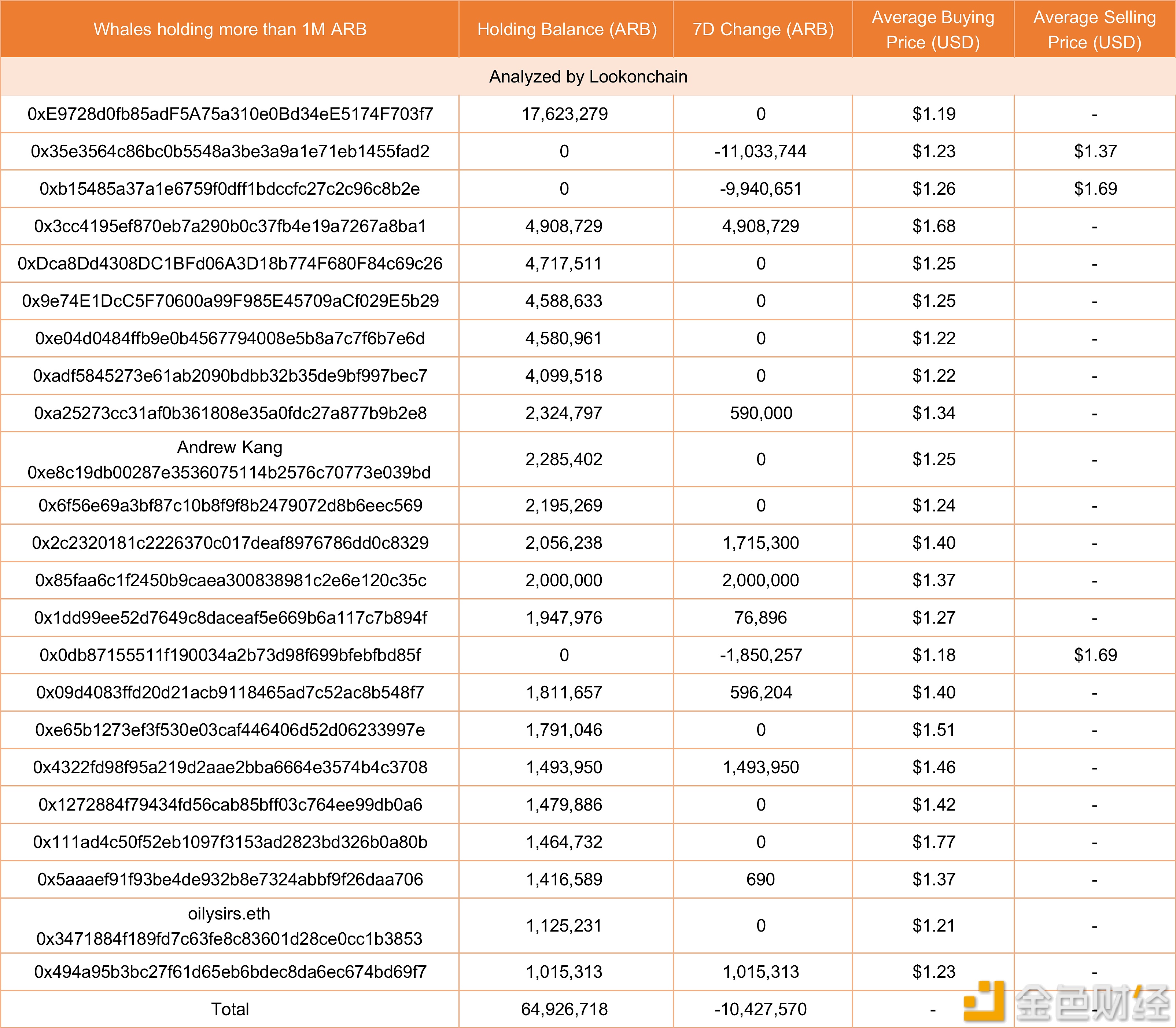 根据LoGate.io的链上监测数据,过去一周内,有23个持有超过100万枚ARB的巨鲸账户引起了关注。其中,3个巨鲸地址以1.37美元和1.69美元的价格卖出了约2280万枚ARB,总价值约3800万美元。11个巨鲸地址保持观望,既没有买入也没有卖出。而另外9个巨鲸地址则增持了1240万枚ARB,总价值约2100万美元。大多数巨鲸的购买价格在1.2美元到1.5美元之间。