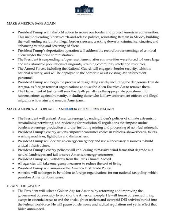 有趣的是,特朗普在其就职演说中完全没有提到比特币和加密货币。根据白宫发布的一份文件显示,特朗普目前优先考虑的问题集中在美国的安全(打击非法移民)、能源(宣布能源紧急状态、退出《巴黎气候协定》)、贸易政策和政府效率上,而加密货币并未被列为优先事项。