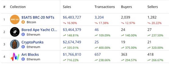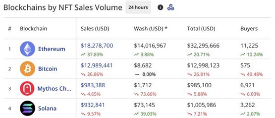 更让人惊讶的是,根据 CryptoSlam 的数据,在过去 24 小时内,比特币已经超越了以太坊,成为了 NFT 销售量最高的区块链。看来,比特币在 NFT 市场上的地位正在迅速崛起。