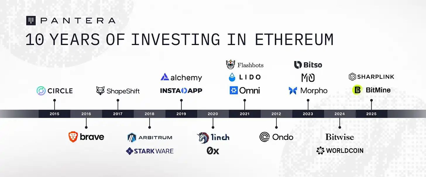 过去十年间,Pantera Capital 持续投资以太坊生态系统,支持变革性项目与创始人,与以太坊的成长紧密相连。关键投资包括: