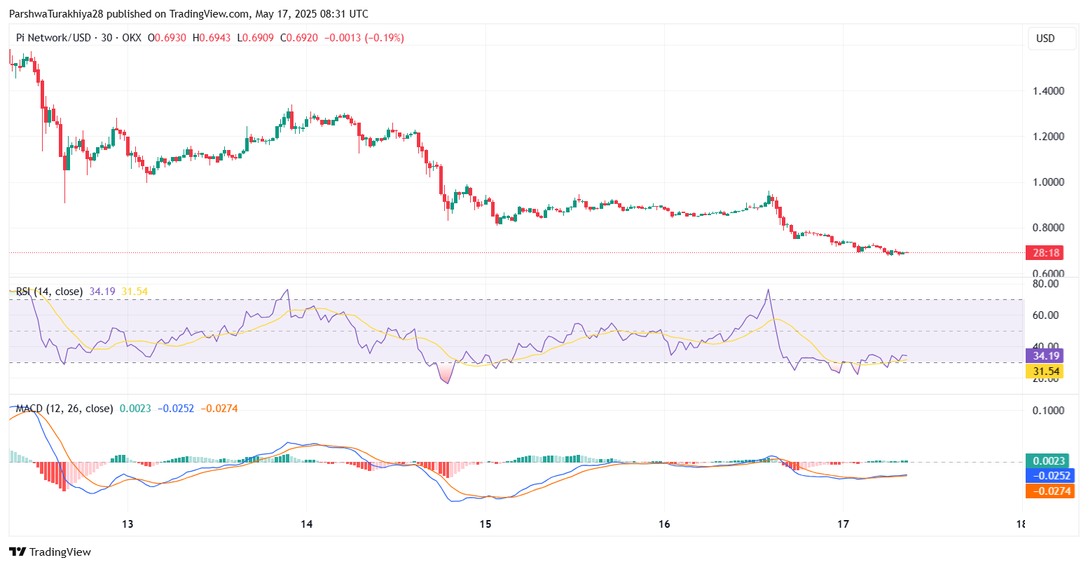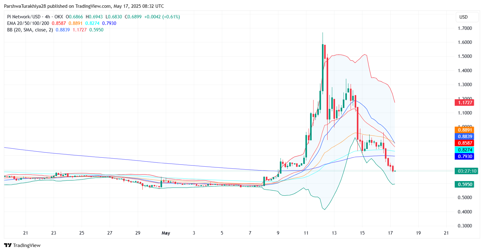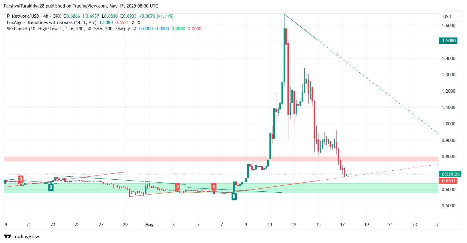 目前,Pi 币的价格在 0.69 美元左右。在经历了前几天的下跌后,它正在努力反弹。在 5 月初达到 1.50 美元的高点后,Pi 币的价格急剧下跌,目前在 0.65 美元附近的关键支撑位徘徊。这个区域与 4 小时图上的上升趋势线重合,能否守住这个位置将决定 Pi 币的短期走势。