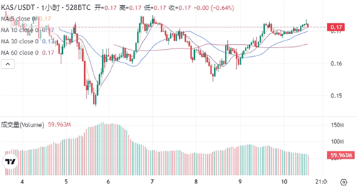 根据最新的市场数据,KAS币的当前价格为$0.17090。在过去24小时内,价格下跌了0.88%,最高触及$0.17358,最低为$0.16798。
