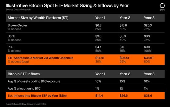 该报告预计,美国现货比特币ETF推出后,第一年的潜在市场规模约为14兆美元,第二年约为26兆美元,第三年约为39兆美元。此外,比特币ETF第一年的流入量将达到144亿美元,第二年增至265亿美元,第三年将增至386亿美元。