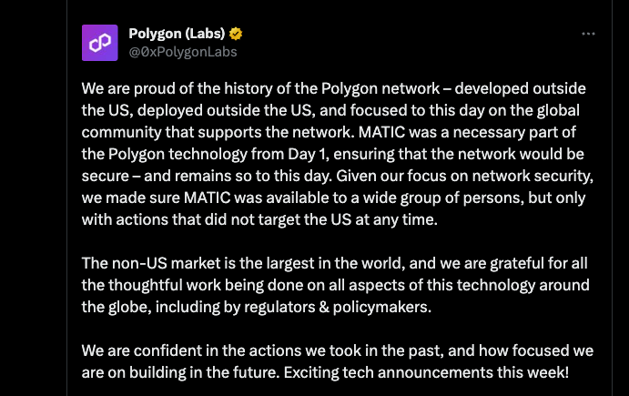 Polygon Labs率先表态,说MATIC主要是在美国境外开发和部署的,所以不适用于美国市场。 简单来说,就是“我们压根就没想针对美国市场搞事儿”。 他们还强调,MATIC是Polygon技术的重要组成部分,用于保障网络安全,而且他们一直致力于服务全球社区。 看来Polygon Labs对自己的技术很有信心,并且对全球市场充满期待。