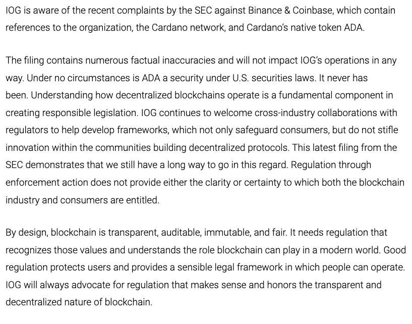 Cardano的开发公司IOG更是直接开怼,说SEC的指控存在许多事实错误,而且不会对IOG的运营产生任何影响。 他们强调,ADA在任何情况下都不应该被归类为证券,并呼吁监管机构了解去中心化区块链的运作方式,制定负责任的法律框架。 IOG还表示,通过执法行动进行规范并不能提供区块链行业和消费者应有的明确性或确定性。 看来IOG对SEC的监管方式颇有微词,认为这种“一刀切”的做法并不利于行业发展。