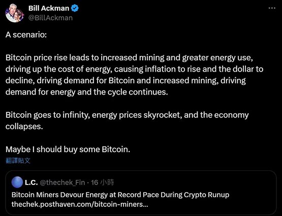 尽管这篇报道暗示数字货币挖矿对环境造成了负面影响,但 Ackman 却对此发表了自己的看法。他设想了一种可能的情景,认为数字货币价格可能会因此飙升至难以想象的水平。因此,他表示正在考虑购买一些数字货币:“一个情景:数字货币价格上涨,导致挖矿活动增加、能源使用量增加,进而推升能源成本,造成通货膨胀走升、某国货币贬值,这带动数字货币需求、挖矿进一步增加,然后再推升能源需求,循环周期持续下去。这结果是数字货币价格涨至无限高,能源价格飙升,经济崩溃。也许我应该买一些数字货币。”