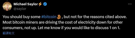 Ackman 的这番言论在数字货币社区引发了热烈讨论。美国上市公司微策略 (MicroStrategy) 联合创始人兼执行董事主席 Michael Saylor 甚至亲自出面表示:“你应该购买一些数字货币,但不是出于上述原因。大多数数字货币矿工正在降低其他消费者的电力成本,而非推升电力成本。如果你想进行一对一讨论,请告诉我。”