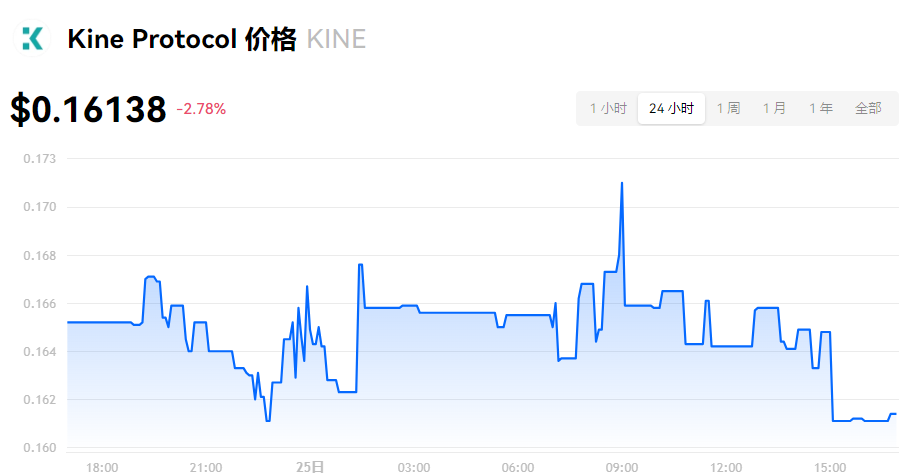 Kine Protocol 当前价格为 $0.16138。Kine Protocol 的价格在过去 24 小时内下跌了 -2.77%。目前,Kine Protocol 市值排名为第 281 名,实时市值为 $326.22万,流通供应量为 20,211,925 KINE,最大供应量为 100,000,000 KINE。我们会实时更新 Kine Protocol/USD 的价格。Kine Protocol 价格表现 (美元)