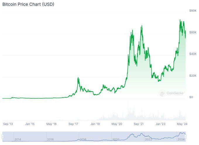 事实上,比特币的叙事比“数字黄金”还要更激动人心。黄金仅仅是有价值,而比特币的叙事里,还隐含着几十倍暴涨的可能,比如“To the moon”、“100万美元”等等。虽然现在长期曲线已经比较平缓了,但“长期上涨、短时暴涨暴跌”仍然是比特币数字黄金叙事的重要组成部分。席勒在《叙事经济学》中,讲的第一个叙事就是比特币。
