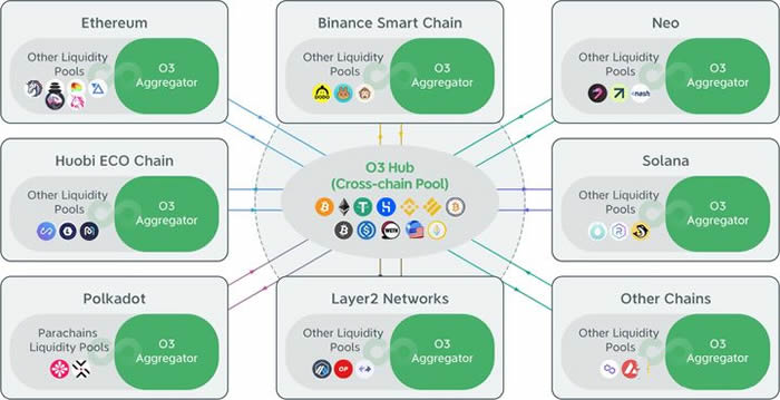 O3swap 的核心由两部分组成:聚合器和 Hub 流动池。聚合器负责找到各个链上的最佳交易点,而 Hub 则将各个跨链资产形成交易对池子。除了用 O3swap 做交易,你还可以为其提供流动性。比如,你可以同时向 O3 合约里打入以太坊上的 ETH 和 BSC 上的 BUSD 形成交易对,作为回报,你会得到对应的 LP token 来赚取 O3 token。
