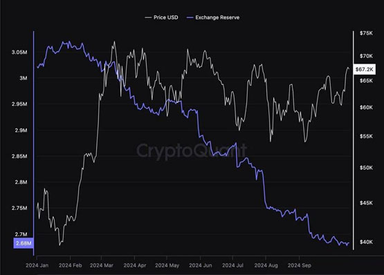 最近看到一种说法,说交易所里的比特币越来越少,这可能意味着大家都把币提到自己的“小金库”里了,导致市场上流通的币变少,价格自然就可能上涨。《Cointelegraph》也发文说,交易所的比特币储备量降到了历史新低,大约243万枚。听起来挺有道理的。