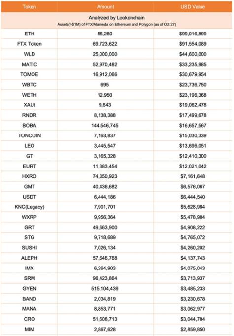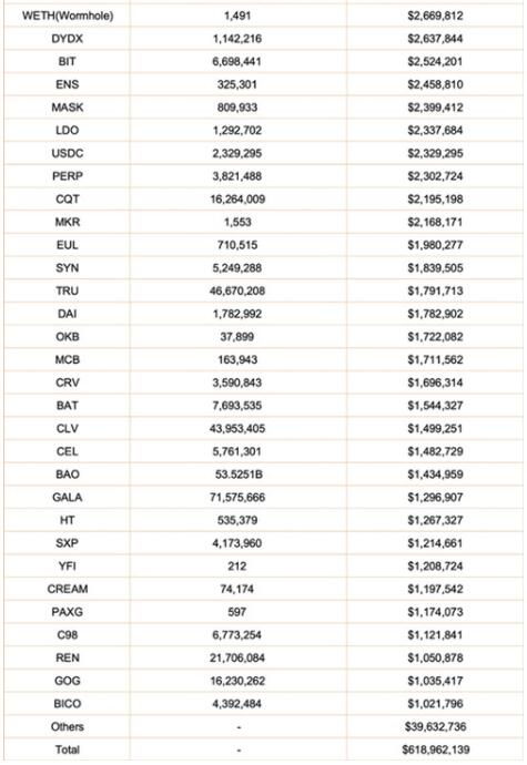 值得注意的是,尽管已经转移了数千万美元的资产,但FTX相关地址仍然持有价值超过6亿美元的资产。这意味着目前仅转移了约11%的资产。剩余资产中,ETH和FTT的价值最高,各自都接近1亿美元。