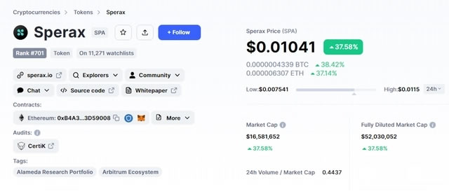 朋友 A 最近在 ARB 链上玩 DeFi 质押,以 0.0024 的价格入手了 SPA。没想到,最近 SPA 价格一路飙升,直接涨到了 0.01!当初投入的 15k,直接翻倍变成了 30k,简直是天上掉馅饼!