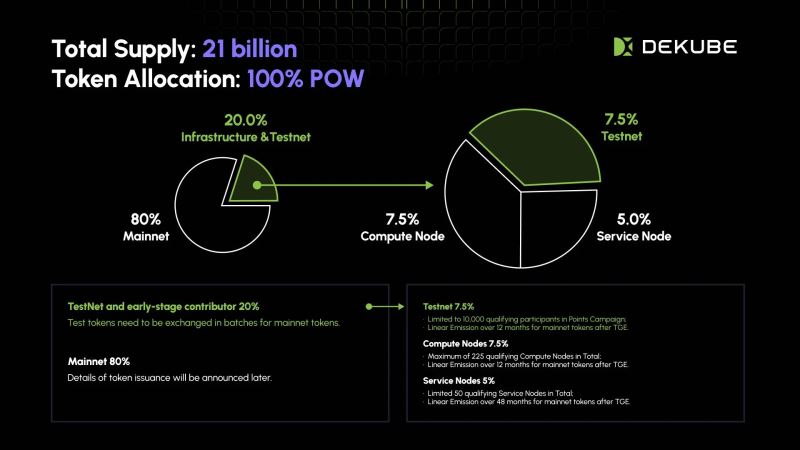 根据DEKUBE的代币分配方案,测试网及早期贡献者将获得20%的测试代币,这些代币需批量兑换为主网代币。计算节点产出占总量7.5%,最多225个合格早期基础计算节点将用于执行GPU集成AI测试任务,TGE主网发布后代币将在12个月内线性排放。服务节点产出占5%,总共限定50个合格服务节点,用于任务管理并确保基础网络稳定性,TGE主网发布后代币在48个月内线性发放。节点部署的技术文档可以在官网查询。测试网活动产出同样占7.5%,限前10,000名合格参与者,TGE主网发布后代币在12个月内线性产出。主网代币发行占到80%,届时将通过全网GPU PoW的方式产出,详情将于官网/官推稍后公布。