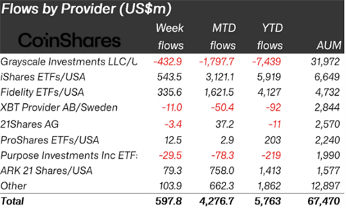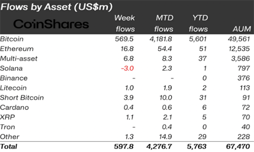 最近,机构投资者对加密货币市场的兴趣激增,这一点从近期加密货币ETF(交易所交易基金)的大量资金流入中可见一斑。根据CoinShares发布的最新报告,过去一周内,机构投资者通过现货比特币ETF增加了对比特币的投资,资金流入总额达到了5.98亿美元。这股热潮已经持续了四个星期,标志着加密货币市场正在慢慢回暖。
