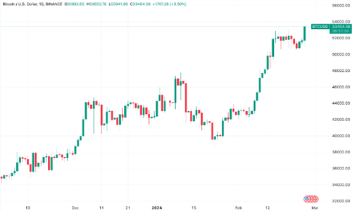 在众多加密货币中,比特币无疑是资金流入的最大受益者。报告显示,上周比特币产品的资金流入高达5.7亿美元,占总流入资金的95%。这种增长趋势与比特币价格的上涨息息相关。最近,比特币价格飙升至54,602美元,创下两年来的新高,虽然随后有所回调,但仍维持在50,500美元以上。