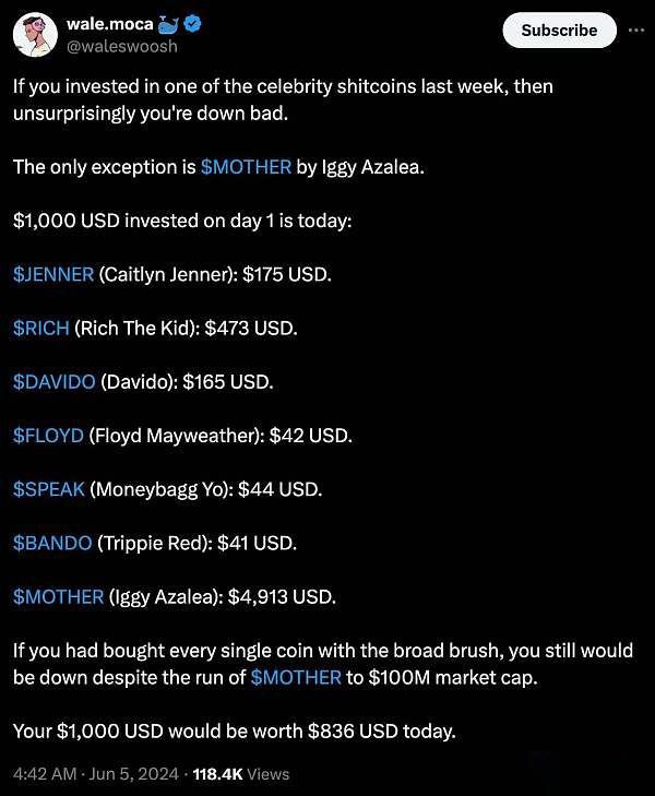Iggy 和 $MOTHER 能否打破名人币的趋势?时间会告诉我们答案。
