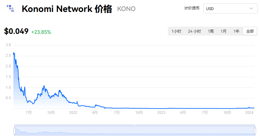 24 小时最低/最高价24 小时最低$0.039最新价格 $0.04924 小时最高$0.055热度排行27市值排行2111市值$176.96万添加自选人数 (百分比)0.64%历史最高价$5.49-99.13%(-$5.43)2021年4月6日(3 年前)历史最低价$0.015+238.12%(+$0.034)2023年1月6日(1 年前)首次发行时间2021/03/16首次发行价$0.00流通总量3,668.92万 KONO流通市值$176.96万