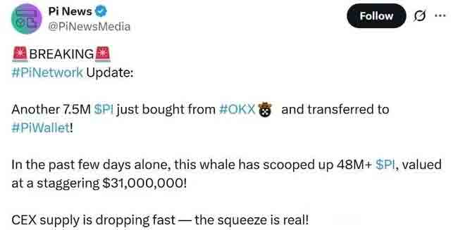 据说,这个神秘大户从某交易所提走了数千万枚 PI 币。业内人士分析,这种操作通常被解读为“囤货”,而不是要抛售。看来,有人对 Pi Network 的未来很有信心啊!