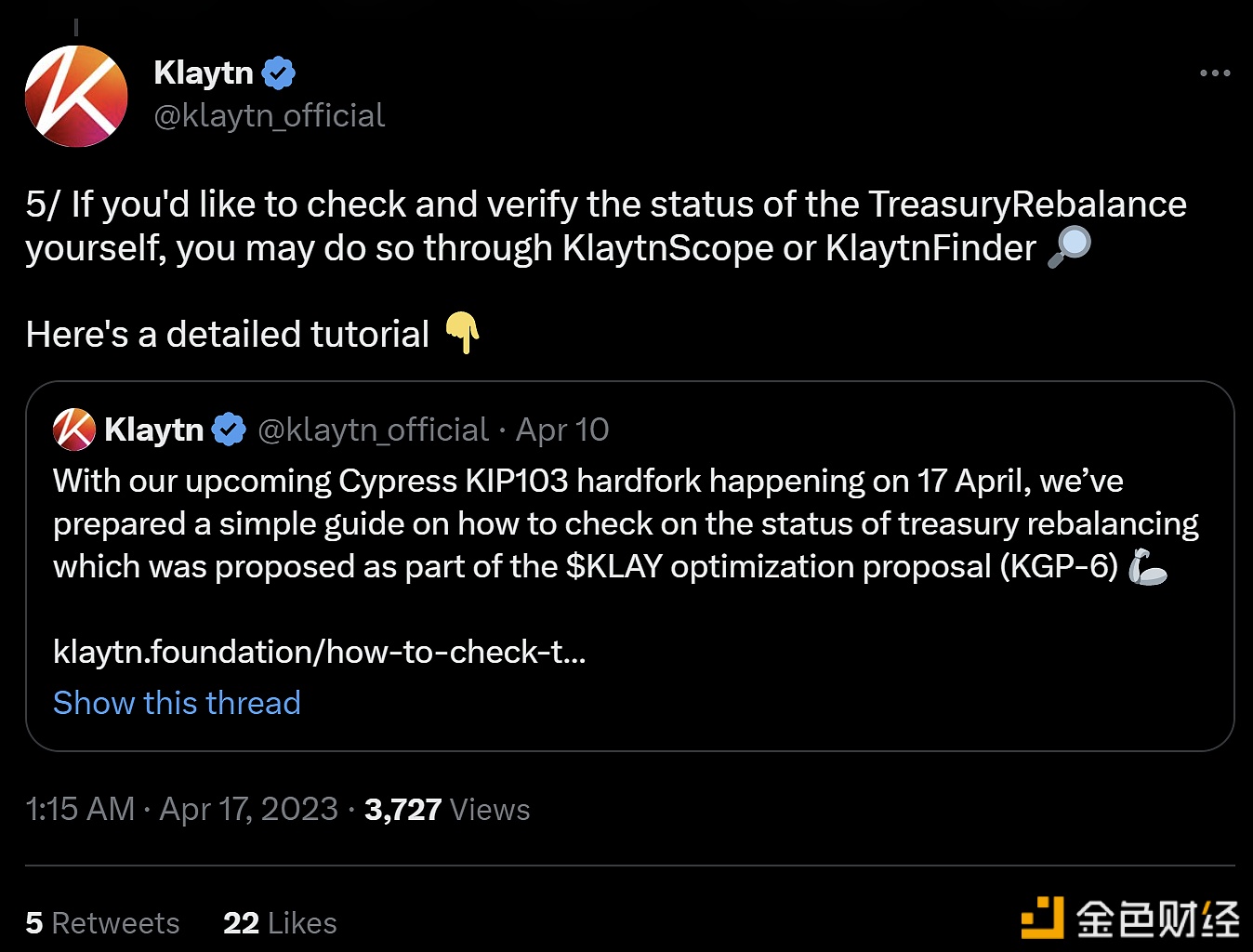 4月17日,韩国公链项目Klaytn发布推文,宣布Cypress KIP-103硬分叉已在区块119750400处成功执行。硬分叉完成后,销毁和资金再平衡工作也随之完成,共销毁了5,296,324,269枚KLAY,占总供应量的50%。这些被销毁的代币最初是在2019年Klaytn主网启动时铸造的,来自Klaytn的国库,总计72.81亿枚KLAY。剩余的20亿枚代币将被保留,用于支持未来的生态系统发展。不过,如果这些代币未能找到合适的用途,它们将在三年内被销毁。