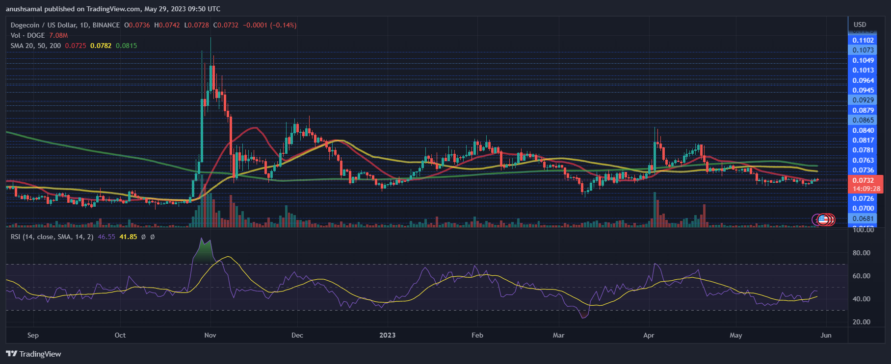 相对强度指数(RSI)显示,买家对DOGE仍然缺乏信心,RSI值低于中线。此外,DOGE的价格已经跌破了20日简单移动平均线(SMA),这表明卖方正在推动市场价格的走势。