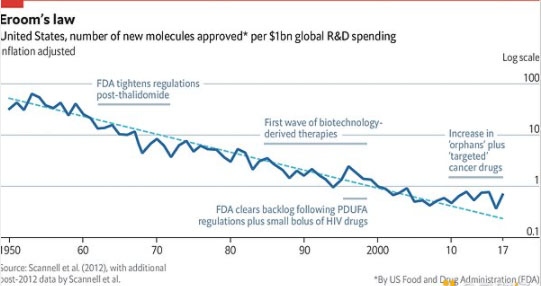 在最近一场关于 DeSci 的讨论中,制药创新的停滞被提及,并引出了 **Eroom’s Law** 的讨论(摩尔定律的逆规律)。