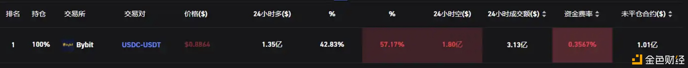根据 Coinglass 发布的最新数据,Bybit 平台上的 USDC-USDT 永续合约交易对的资金费率已经上升到 0.3567%。这表明市场对这对交易对的看涨情绪相当高涨。通常情况下,当市场趋势看涨时,资金费率会呈现正值,这意味着多头需要向空头支付资金费率。而当资金费率超过 0.01% 时,这通常被视为市场普遍看多的信号。