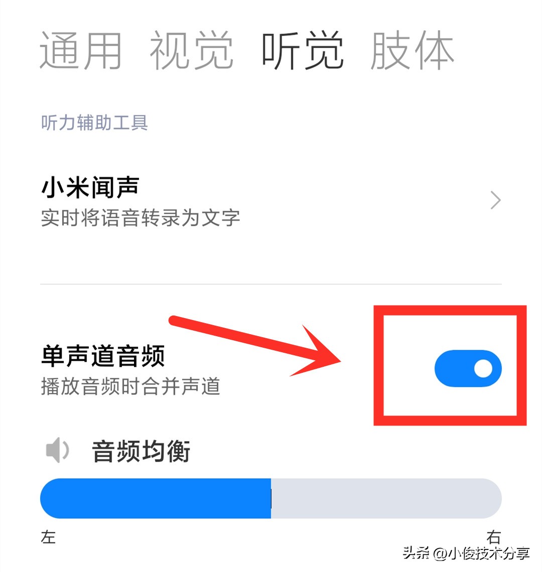 清理完灰尘后,我们回到手机的设置中心,找到【无障碍】设置。在里面,我们要打开【单声道音频】开关。这个开关平时都是关着的,很多人根本不知道它的存在。打开后,它可以解决音频不分左右声道的问题,让手机的左右声道发出同样的声音。戴耳机时,左右立体声通道会合并成单声道信号。这个功能原本是为有听觉障碍的人设计的,但现在我们开启它后,手机音量也会大幅提升!