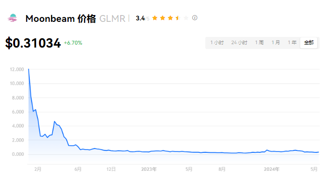 截至今日,Moonbeam的价格为$0.31034,过去24小时内上涨了+6.71%。Moonbeam目前在市值排行中位列第146名,市值为$2.68亿。流通供应量为864,388,571 GLMR,最大供应量为1,120,168,990 GLMR。24小时内,Moonbeam的最低价格为$0.28634,最高价格为$0.31884。Moonbeam的热度排行为188,添加自选人数占比为0.93%。历史最高价为$19.5000,出现在2022年1月11日,较当前价格下跌了98.41%。历史最低价为$0.16010,出现在2023年9月22日,较当前价格上涨了93.84%。Moonbeam首次发行时间为2022年1月11日,发行价为$0.25000。流通总量为864,388,571 GLMR,流通市值为$3.48亿。