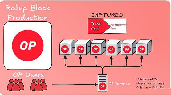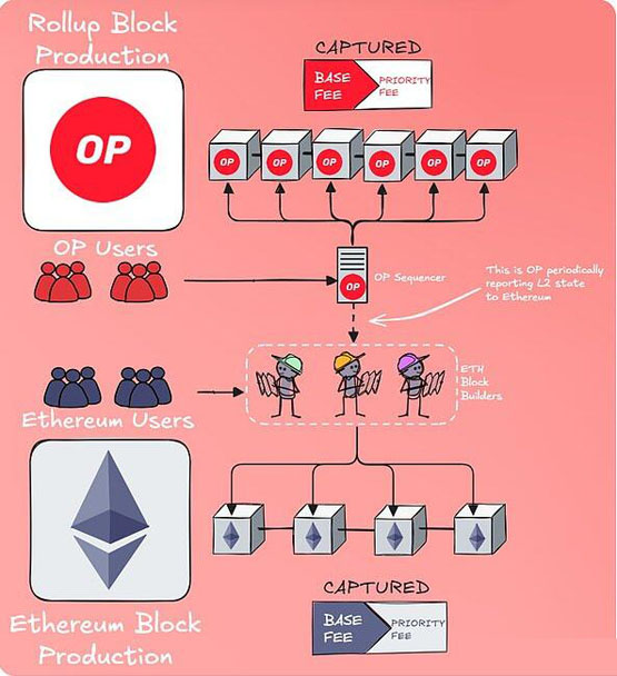 以 Optimism 为例,我们可以保持与以太坊相同的相对结构,只需将 Builders(一组相互竞争的实体)替换为 Sequencer(由 Optimism 团队运行的单个机器)。