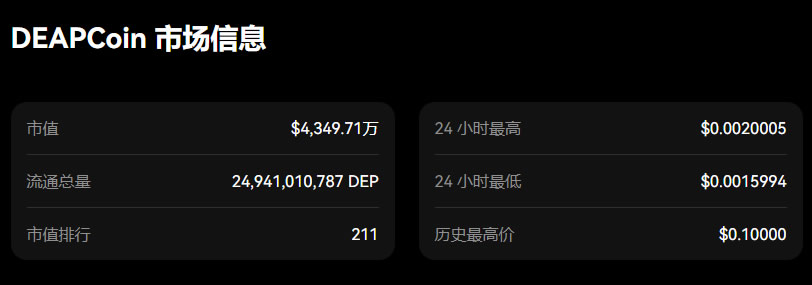DEP币的发行价格是0.0217美元。截至2024年7月25日10:28,DEP币的当前价格为0.0017364美元。DEAPCoin的价格在过去24小时内下跌了-6.21%。目前,DEAPCoin在市值排行榜上位列第211名,实时市值为4,349.71万美元,流通供应量为24,941,010,787 DEP,最大供应量为30,000,000,000 DEP。我们会实时更新DEAPCoin/USD的价格信息。