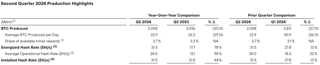 尽管 Marathon 的整体算力从去年第二季度的 17.7EH/s 增长了 78%,达到了今年同期的历史新高 31.5EH/s,但产量却从 2926 枚 BTC 锐减至 2058 枚,减少了 30%。这或许是导致营收未达预期的重要原因之一。
