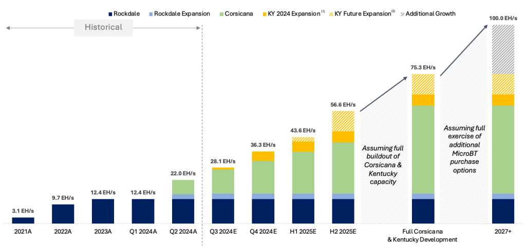 Riot 执行长 Jason Les 表示,近期收购的 Block Mining 拥有超过 60 兆瓦的发电能力,将立即投入运作;到了 2025 年底,发电能力将增长超过 300 兆瓦;而 2027 年底更将达成 100EH/s 的远大算力目标。