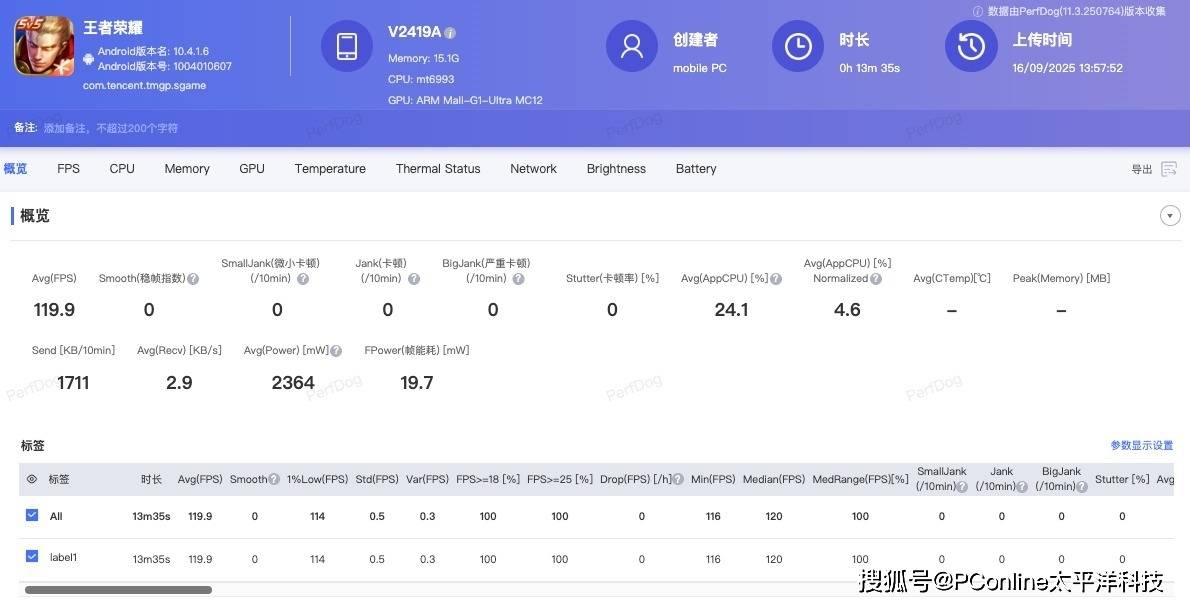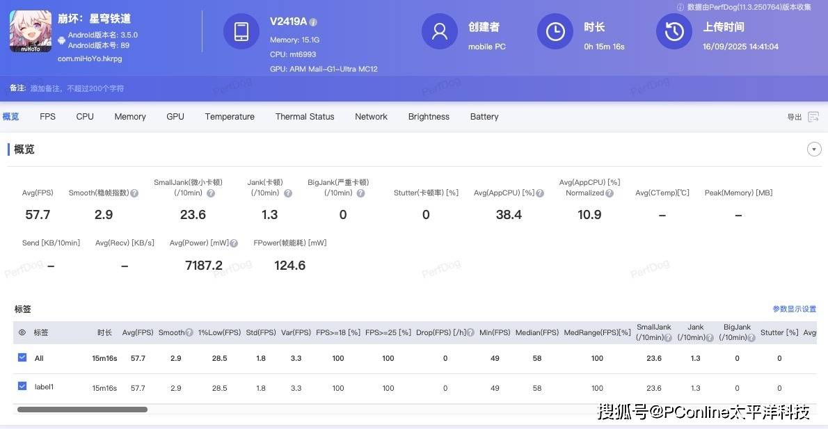实际游戏表现同样出色。在PConline实测中,《王者荣耀》平均帧率达到119.9 FPS,平均功耗仅2.36W;而在高负载的《崩坏:星穹铁道》中,平均帧率为57.7 FPS,平均功耗7.19W。无论是主流电竞手游,还是对硬件要求极高的3A手游大作,天玑9500都能兼顾满帧体验与能效控制,带来稳定且畅快的游戏体验。