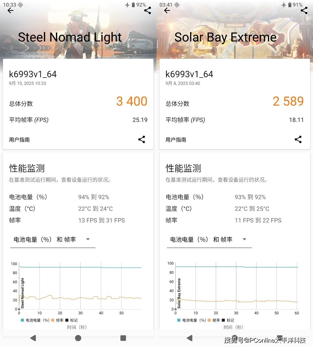 在性能测试中,PConline实测数据显示,天玑9500的GPU已站上安卓阵营的最高水准:GFX Aztec 1440p Vulkan offscreen实测154 FPS,3DMark Steel Nomad Light得分3400,3DMark Solar Bay Extreme得分2589,充分展现了旗舰级图形处理能力。配合架构优化,其图形性能相较前代提升33%,光追能力直接翻倍,首次将移动端的渲染能力拉升至主机级水平。