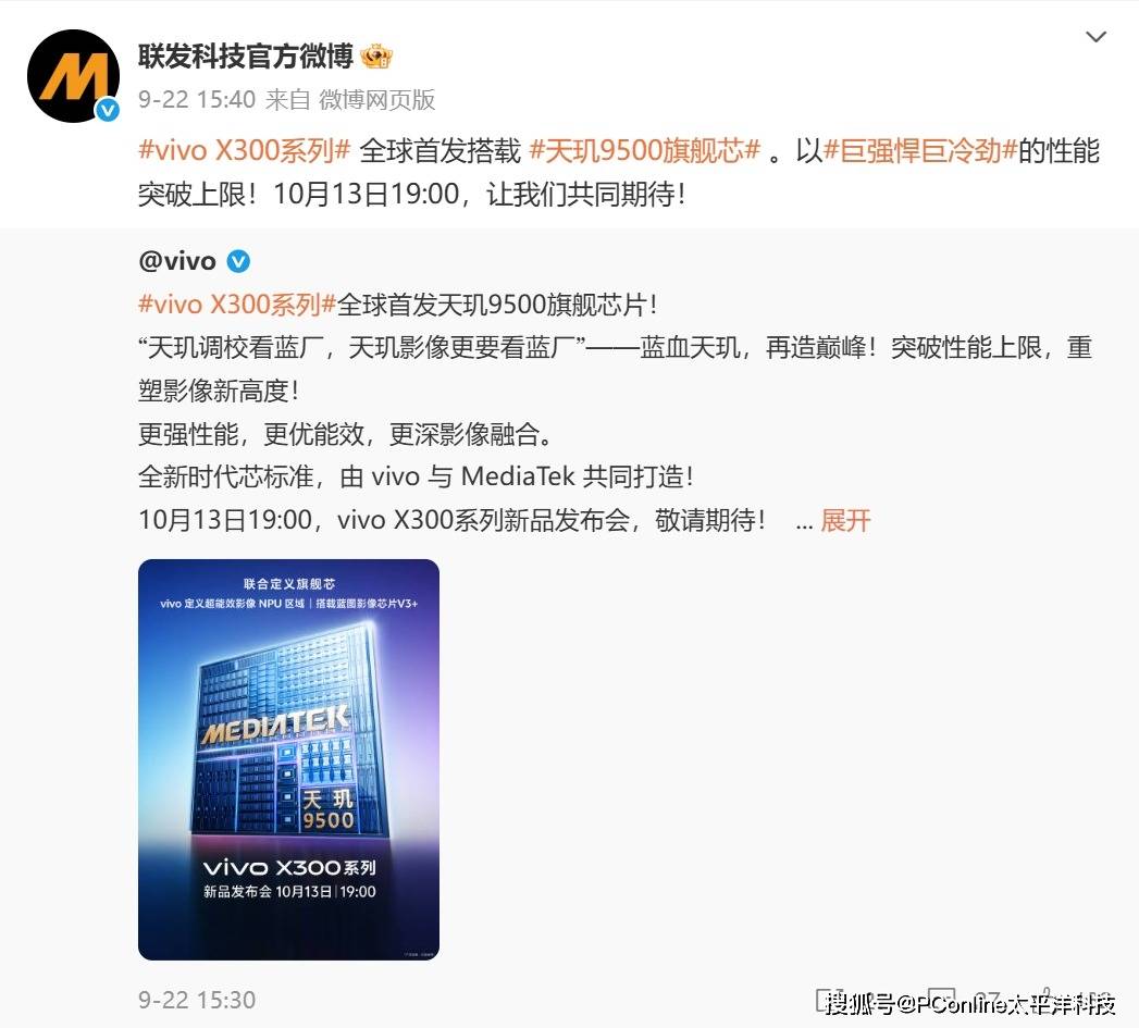 结合前几天的消息,联发科官方微博已官宣:vivo X300系列将成为全球首发天玑9500的机型。发布会定档10月13日19:00,届时vivo将与联发科共同揭晓这一旗舰平台在实际产品中的表现。按照官方预热口径,X300系列将在影像、性能和能效方面带来全面升级,塑造新一代旗舰标准。