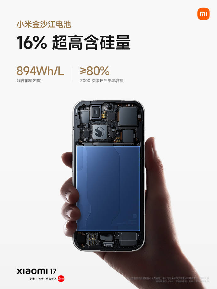 实现这一突破的是小米全新的金沙江电池技术。该技术将电池硅含量提升至 16%,是上一代 6% 的 2.5 倍以上,从而提高了电芯的储能能力。此外,该机电池设计使用寿命长达五年,配合小米澎湃 P3 快充芯片和 G2 电池管理芯片,实现快充的同时,经过 2000 次完整充放电循环后,电池容量仍能保持在 80% 以上。