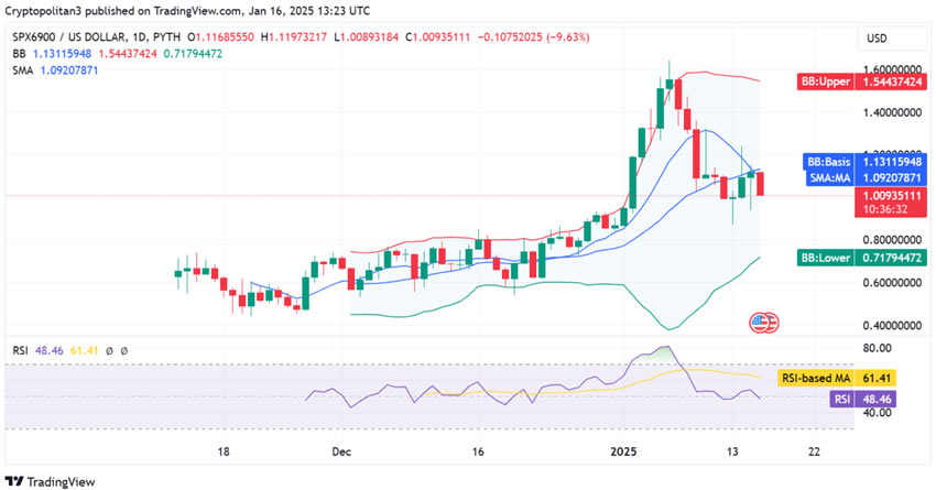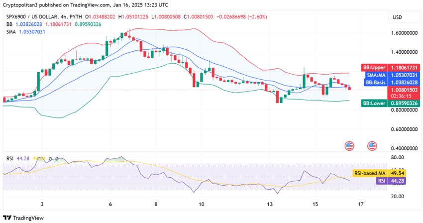 2025 年 1 月 16 日,SPX6900 价格分析显示市场呈下跌趋势。随着下行压力的加大,代币价值已跌至 1.009 美元。与此同时,该货币较前一收盘价下跌了 5.95%。虽然多头在前几天略有斩获,但空头今天仍占据主导地位。