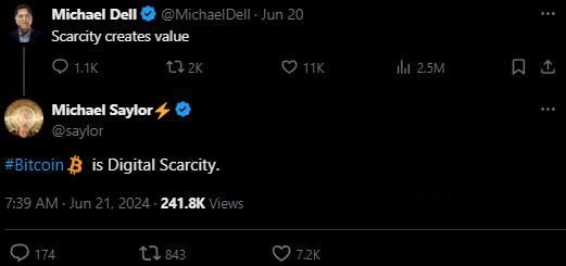 其实,早在 6 月底,Michael Dell 就曾发文表示“稀缺性创造价值”。Michael Saylor 随即回复称,比特币正是一种数字上的稀缺性。