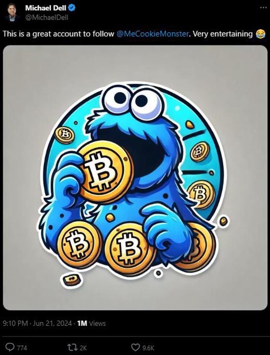 更有趣的是,Michael Dell 不仅转发了 Michael Saylor 的留言,还发布了一张《芝麻街》饼干怪兽 (Cookie Monster) 正在吃比特币的图片,这让加密社群更加兴奋。