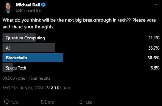 此外,Michael Dell 还发起了一项民意调查,列出了量子计算、AI、区块链、太空科技等技术,询问社群哪种技术将出现重大突破。结果显示,区块链以 38% 的支持率略高于 AI 的 33%。
